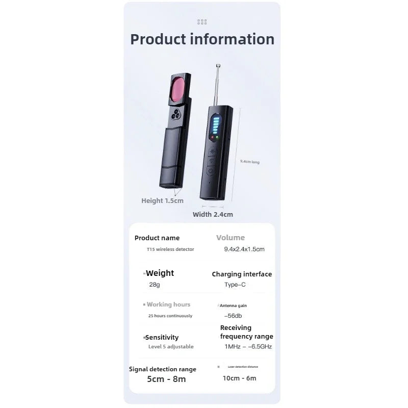 The T15 RF Signal Detector is a compact multi-function surveillance detection device designed to help locate hidden cameras, wireless audio bugs, GPS trackers, and other unauthorized electronic devices. It detects RF signals ranging from 1 MHz to 8 GHz, including 2G, 3G, 4G, GSM, and Wi-Fi. The built-in infrared scanner identifies hidden pinhole cameras by reflecting infrared light from camera lenses. A magnetic field sensor is included for detecting magnetized GPS devices in vehicles.